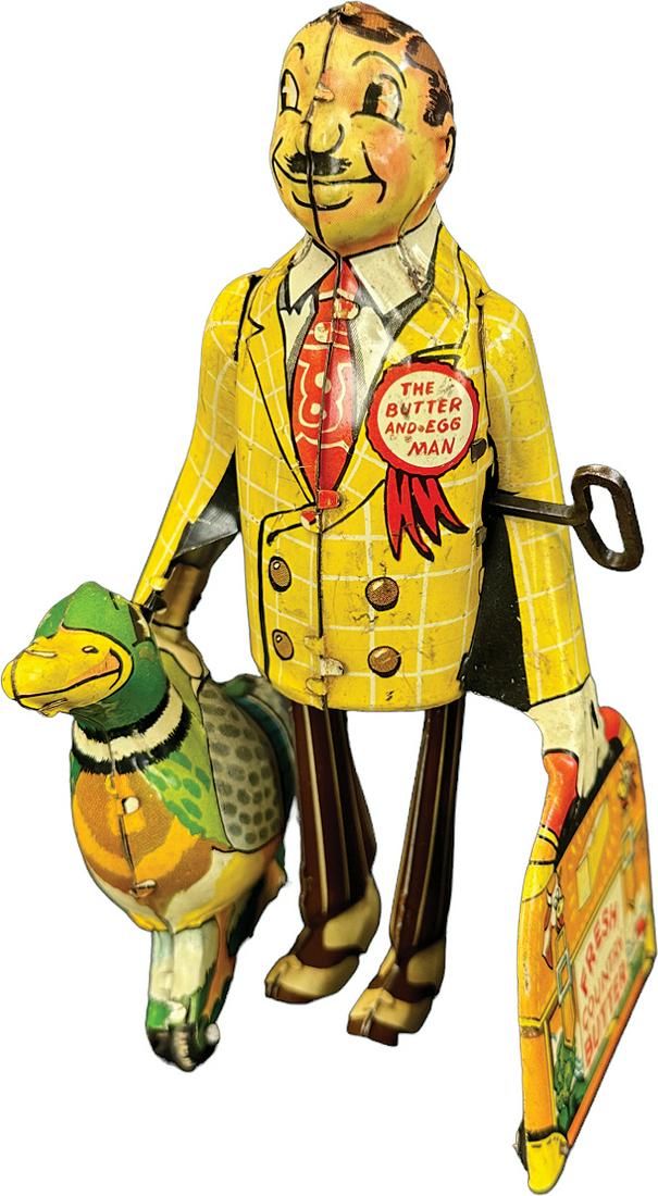 SoldMarx Butter & Egg Man Tin Litho Wind Up ToyDESCRIPTION: Marx tin lithograph The Butter and Egg Man mechanical toy with duck. Circa 1930s. MEASUREMENTS: 7-3/4" high. CONDITION: Some wear and corrosion. Works.See Sold Price