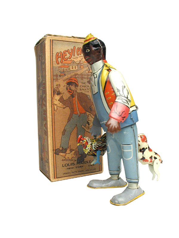 SoldMarx Hey Hey! The Chicken Snatcher Tin Toy1920s Louis Marx Hey Hey! The Chicken Snatcher Tin Toy. Jim Crow era toy depicts a man holding a stolen chicken in his hand while a dog attempts to stop the snatcher by biting at the seat of his pantsSee Sold Price