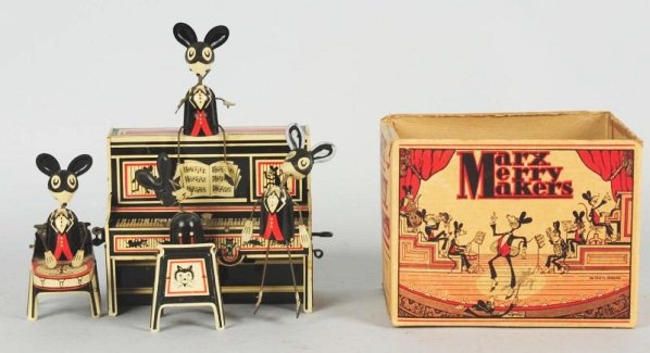 Sold897. Marx Merrymakers Band. New York, Louis Marx, ca.897. Marx Merrymakers Band. New York, Louis Marx, ca. 1929. Lithographed tin wind-up toy. Features four mice, two in band, one dancer, one seated conductor on top of piano. 9 x 8”. Working.See Sold Price