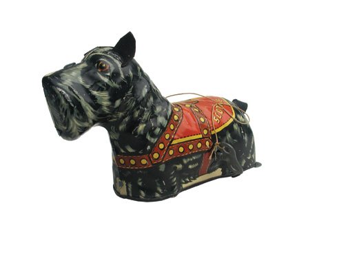 Sold1940's Tin Scottie Dog Wind Up Toy By MARX ToysVintage tin Scottie dog wind up toy by MARX Toys with wagging tail. Rubber Ears are missing.See Sold Price