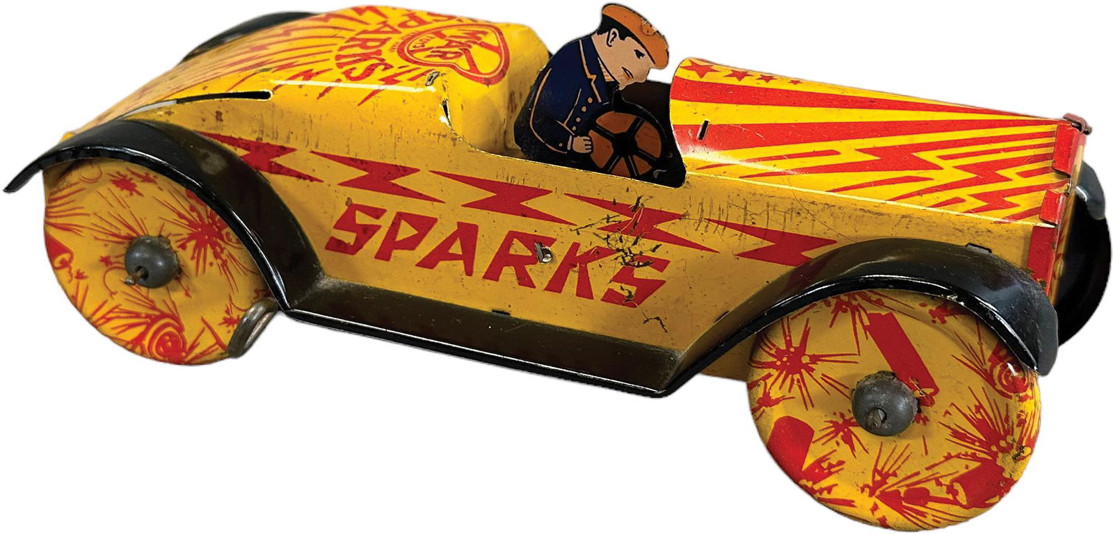 SoldMARX SPARKS RACERLithographed tin, colorful graphics overall, seated figure, sides read "Sparks." 8" l.See Sold Price