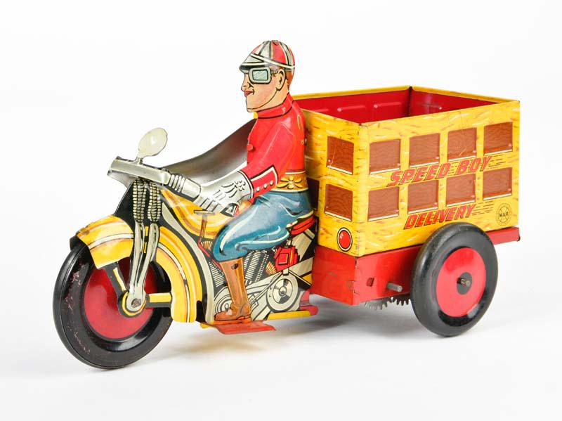 SoldMarx Speed Boy 4 Delivery Tin Litho Wind-Up ToyMarx Speed Boy 4 delivery motorcycle wind-up and battery powered tin litho toy, c. 1930s. 9 3/4"L x 5 3/4"H. Untested. No bulbs in lights, paint loss and wear consistent with age, corrosion to batterySee Sold Price