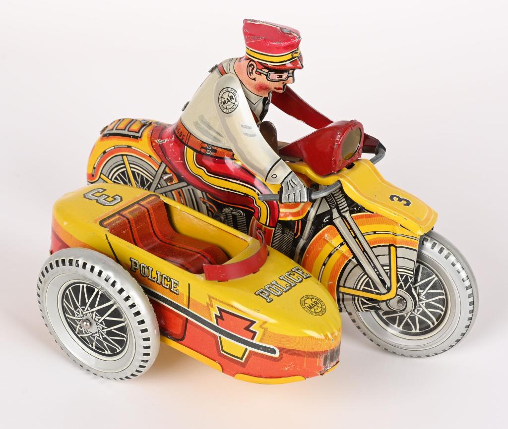 SoldMarx Tin Litho Wind-Up Police Motorcycle with Sidecar, circa 1950sA vintage Marx tin lithographed wind-up toy depicting a police motorcycle with an attached sidecar. The toy features a police officer in uniform, with vibrant lithography displaying "POLICE" prominentSee Sold Price