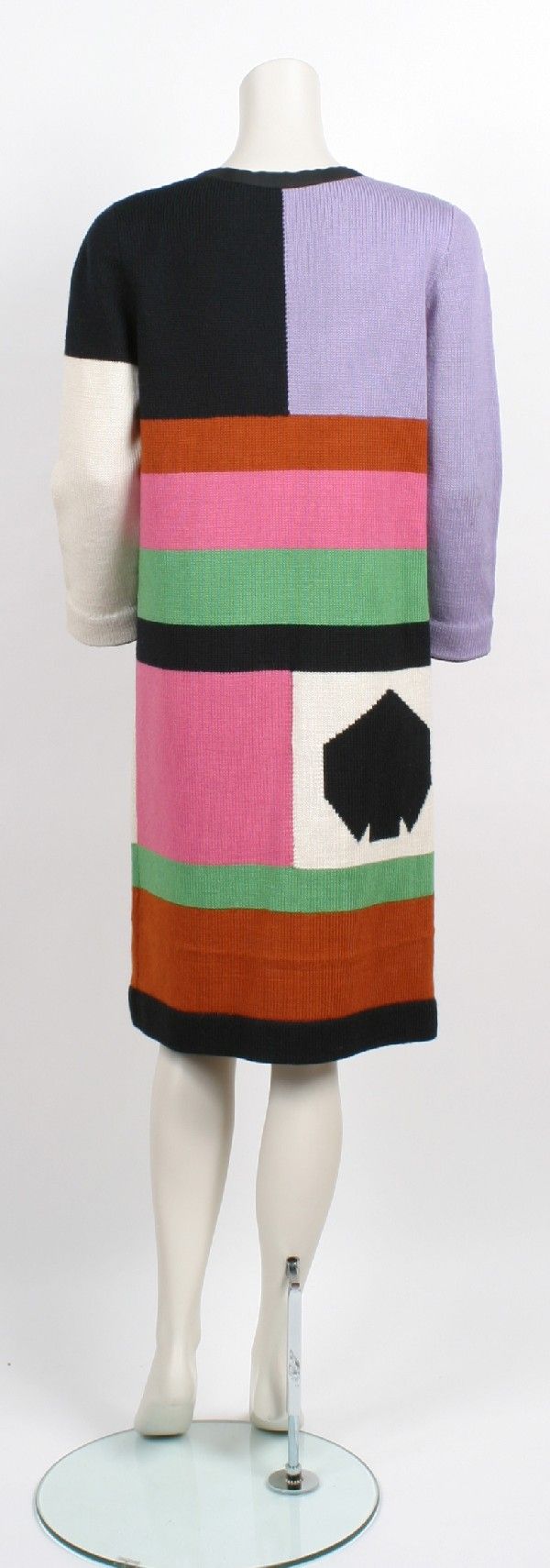SoldMISSONI SEPARATES & MARY MCFADDEN DRESS, ITALY & AMERICA, LATE 20TH C2-pc sweater set of synthetic blend w/ multicolored stripe in autumnal tones c/o cardigan & long sleeve, label "Missoni Maglia Knitwear Tricot, Made in Italy", shirt B 30", L 28", cardigan B 36", L 31See Sold Price