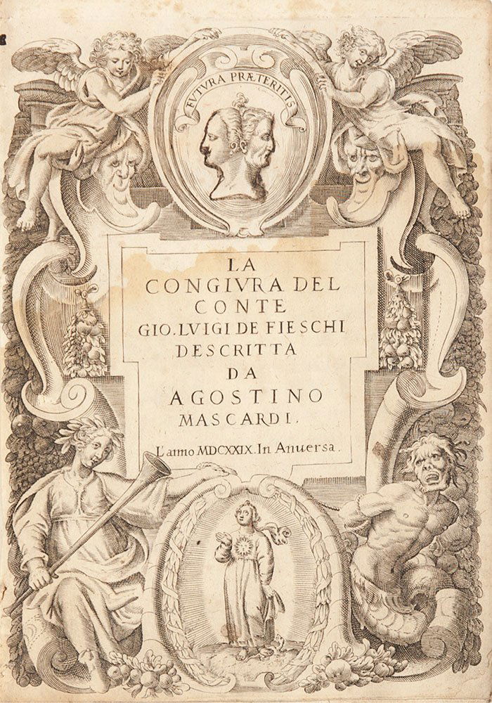 SoldMascardi, AgostinoLa congiura del conte Gio. Luigi de' Fieschi Venezia, Giacomo Scaglia, 1637. In 4°. Grande marca xilografica al frontespizio, fregi e capilettera incisi in legno nel testo, frontespizio leggermente aSee Sold Price