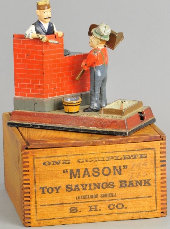 SoldMASON BANK MECHANICAL BANK453. MASON BANK MECHANICAL BANK | Shepard Hardware Co. | 7" w. | Repaint to grey bricks at bottom of wall, hod carriers blue pants & the brick setter figure are repainted. | $600 - $1,200See Sold Price