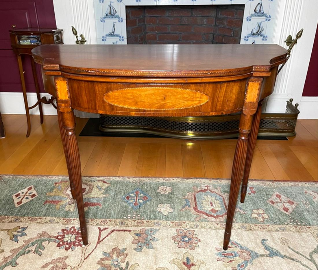 SoldMassachusetts Sheraton Mahogany Card TableMassachusetts Sheraton Mahogany Card Table. C. 1810. Satinwood inlay, serpentine front and reeded legs. Ht. 29" W 35 1/2" D 17 1/2" (closed). A Lockport, NY Estate.See Sold Price