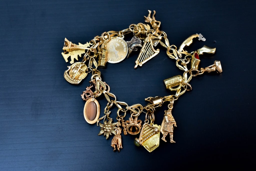 VINTAGE GOLD FILLED LADIES BRACELETS - LOT OF 3Mar 08, 2026Eight Charms Link Bracelet 14kt gold 7.5 inch 14gm**Eight Charms Link Bracelet 14kt gold 7.5 inch 14gm**Eight Charms Link Bracelet 14kt gold 7 inch 43gm**Eight Charms Link Bracelet 14kt gold 7 inch 43gm**Nine Charms Link Bracelet 14kt gold 7 inch 54gm**Nine Charms Link Bracelet 14kt gold 7 inch 54gm**Figaro Link 14kt Gold Bracelet 8.25 inch 10mm 28 Gram Unisex**14kt Gold 6 Charm Functional Bracelet Sun Dog Windmill Frame Lilly 104gr**Vintage 1950's Pearl Shoes Hat Police Charm Bracelet 14K Yellow Gold, 59.27 Gram14K gold charm bracelet with 18 charms, including animals and other objects of travel. 6 charms5 days Left14K Gold Charm Bracelet2 days Left14K gold charm bracelet with 14 charms, including a 1907 US liberty head $5 gold coin (drilled),5 days LeftWomens Vintage Estate 14k Yellow Gold 17 Charm BraceletMar 19, 2026Vintage 14k Gold Charm Bracelet with 17 Assorted Collectible Charms3 days Left14K gold charm bracelet with 18 charms, including objects from travel, teapots, lanterns,5 days Left
