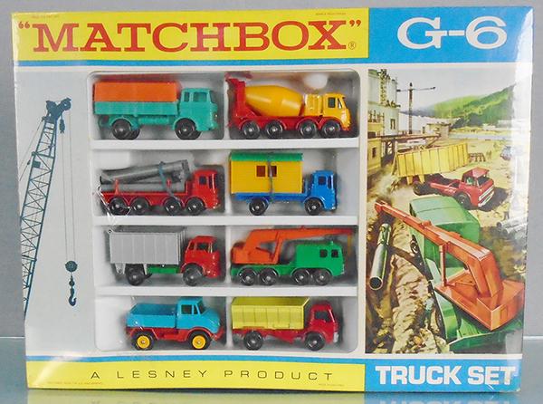 SoldMATCHBOX G-6 TRUCK SETcontains 30C2, 70B2, 26C1, 49B2, 21D1, 60B1, 10D1, 1E1, orig box & insert factory sealed, some minor tears, box has wear from shrinking shrinkwrap, C10.See Sold Price