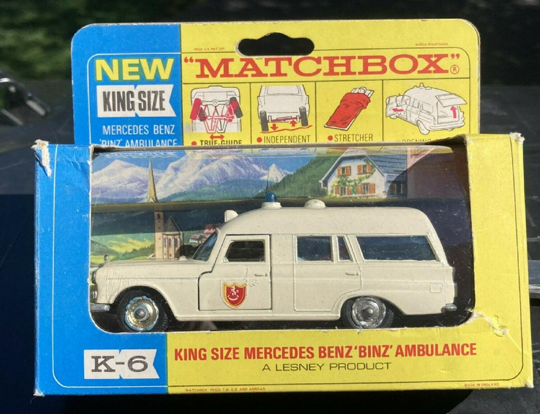 SoldVINTAGE MATCHBOX TOYS KING SIZE MERCEDES BENZ "BINZ" AMBULANCE #K6VINTAGE MATCHBOX TOYS KING SIZE MERCEDES BENZ "BINZ" AMBULANCE #K6 CONDITION: PRE-OWNED SHIPPING FEE CANADA 10.00$ USA 15.00$ Combined shipping is available for an extra fee, but only on items won onSee Sold Price