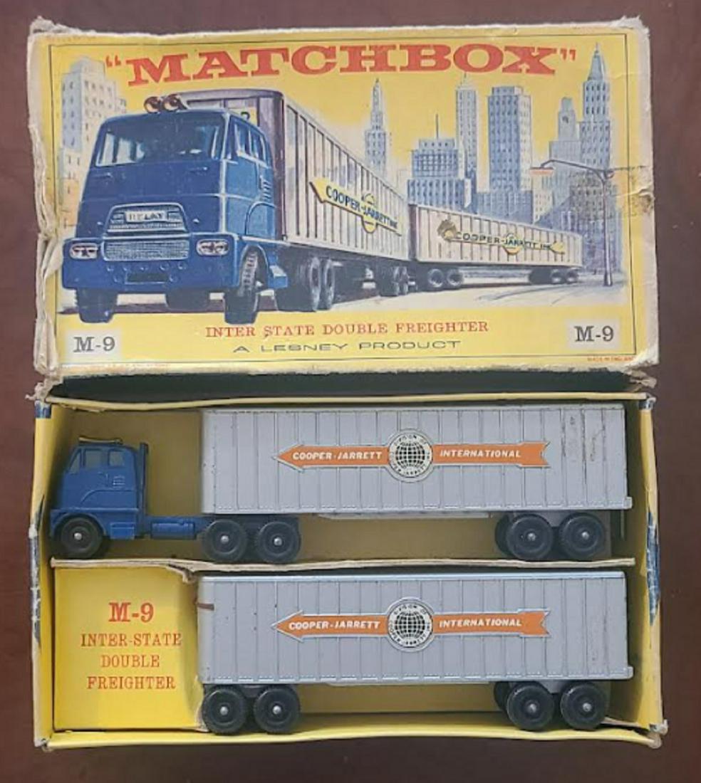 SoldLesney Matchbox Major Pack M-9 Inter-State Double Freighter Cooper-Jarret w/ BoxIn very good condition as shown Box looks to be in very good condition as well, bright colors, inner tab/divider is torn as shown More difficult to find toy trucks by Matchbox Photos describe itSee Sold Price