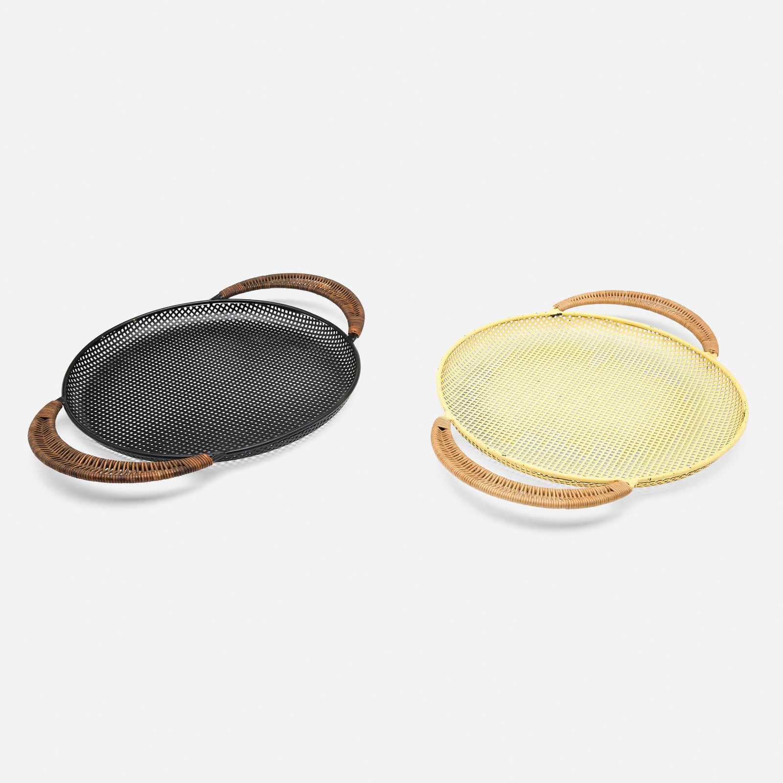 SoldM. Mategot (attributed), Bowl and tray, 1950sM. Mategot (attributed), Bowl and tray, 1950s, Mathieu Mategot (attributed). H. 14.5 x 44.5 x 38 cm; 40 x 34 cm. Made by Artimeta, Soest (attributed). Perforated sheet metal, painted white, tubular brSee Sold Price