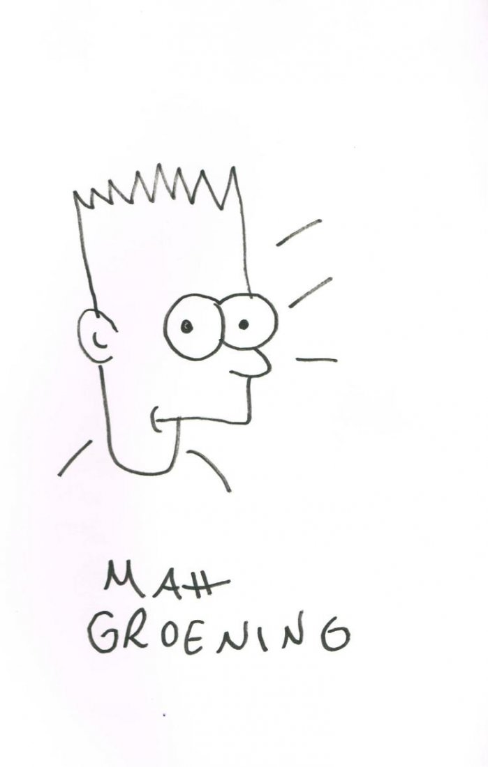 SoldMatt Groening Original Signed Drawing of Bart SimpsonMatt Groening Original Signed Drawing of Bart Simpson in 2013 Comic Con Futurama Comic Matt Groening Spectacular Full size Original Black Felt Tip drawing of Bart Simpson placed on the inside of the fSee Sold Price
