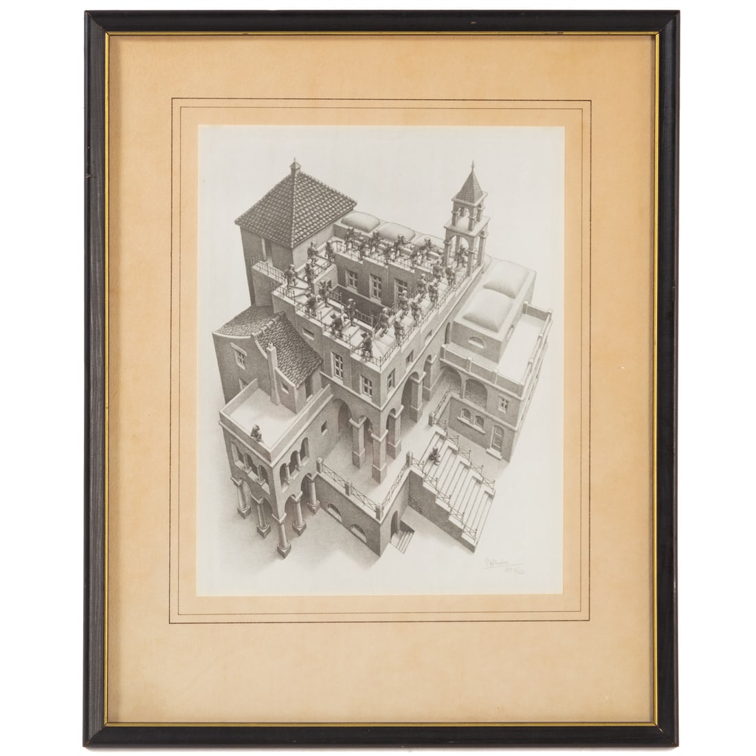 M.C. Escher - Waterfall - Offset Lithograph 25.75" x 21.75"AFTER ESCHER DUTCH IMPOSSIBLE OBJECT OFFSET PRINTMar 08, 2026M.C. ESCHER (1898-1972) LITHOGRAPH TITLED BELVEDERE, 1958, 16IN x 17.5IN (41cm x 44cm)18 hrs LeftM.C. ESCHER (1898-1972) LITHOGRAPH TITLED REPTILES, 1943, 17IN x 19IN (43cm x 48cm)18 hrs LeftM.C. ESCHER (1898-1972) LITHOGRAPH TITLED BOND OF UNION, 12.5IN x 15IN (32cm x 38cm)18 hrs LeftM.C. ESCHER 'UP AND DOWN' LITHOGRAPH5 days LeftM.C. ESCHER (1898-1972) LITHOGRAPH TITLED ENCOUNTER, 1944, 12IN x 15IN (31cm x 38cm)18 hrs LeftM.C. ESCHER (1898-1972) LITHOGRAPH TITLED HAND WITH REFLECTING GLOBE, 25IN x 30.5IN (64cm x 77cm)18 hrs LeftM.C. Escher linocut etching on paper after Dutch Op Art optical illusionMar 11, 2026