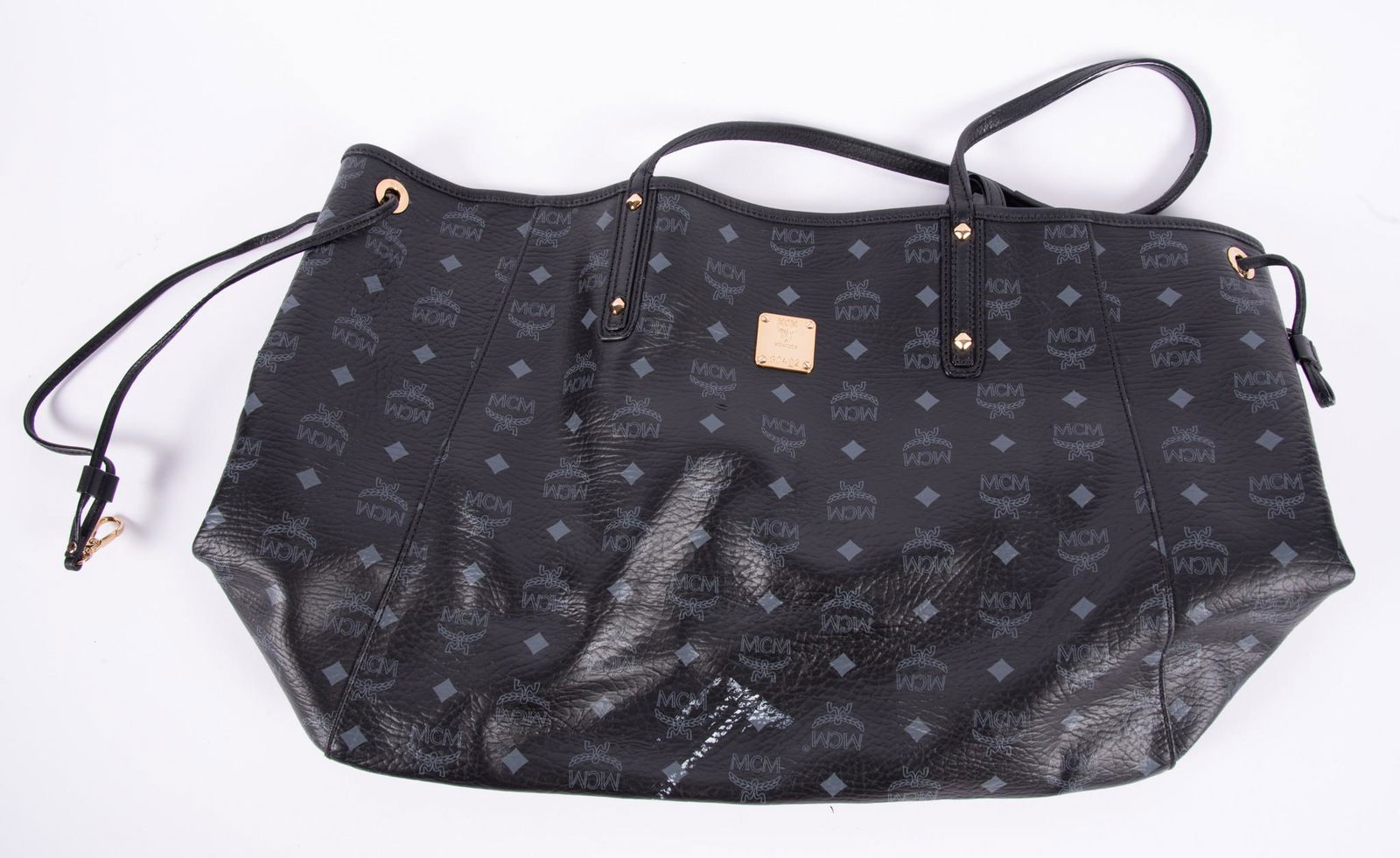 SoldMCM MONOGRAM COATED CANVAS DOUBLE STRAP TOTE BAGMCM tote bag in black monogram coated canvas, having a brass plaque to front pocket, duel flat shoulder straps over the zipper top opening to single hanging zipper pocket, accompanied by certificate oSee Sold Price