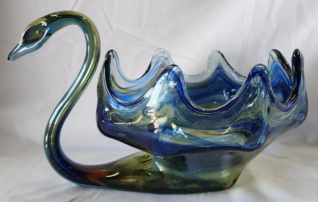 SoldLORRAINE ART GLASS SWAN BOWL 13"LORRAINE ART GLASS SWAN BOWL 13" -VERY GOOD PRE OWNED CONDITION -APPROX 13" X 11" -MID-CENTURY MURANO ART GLASS STYLE SWAN CENTERPIECE BOWL. STUNNING HAND-BLOWN SCULPTURE IN VIBRANT SHADES OF EMERALDSee Sold Price