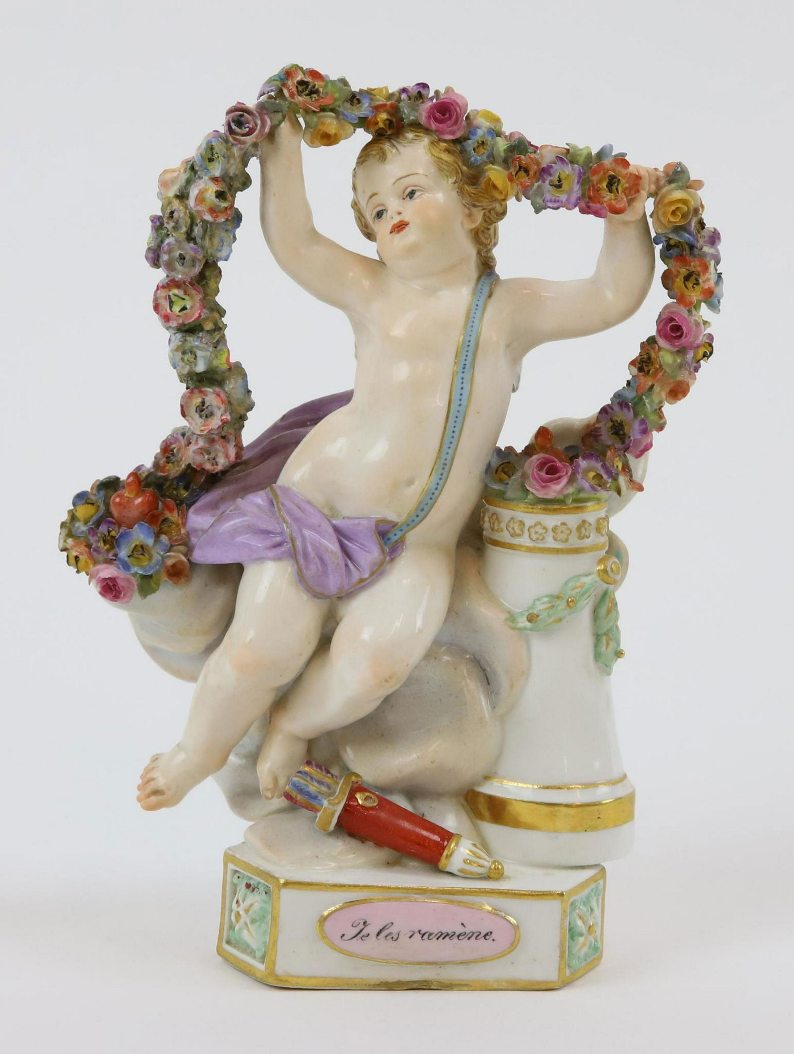 SoldMeissen Porcelain Cupid Cherub FigurineDESCRIPTION: A Meissen porcelain Cupid cherub figurine. This is a Meissen porcelain figure from the L-Series. Numbered L118. and titled "Cupid with a basket". Marked with the double sword "Meissen" haSee Sold Price