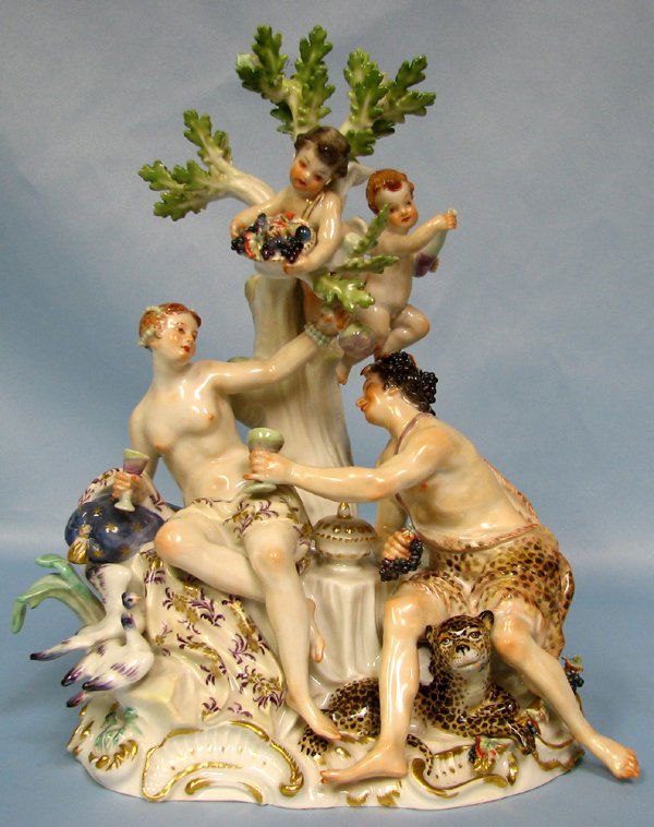 SoldMEISSEN PORCELAIN FIGURE GROUP C. 1900MEISSEN PORCELAIN FIGURE GROUP, C. 1900, H 6 1/4", W 5", 'AUTUMN':Allegory of autumn modeled as a seated girl, standing boy, and a goat, with grape vine and basket; marked in blue underglaze with crosSee Sold Price