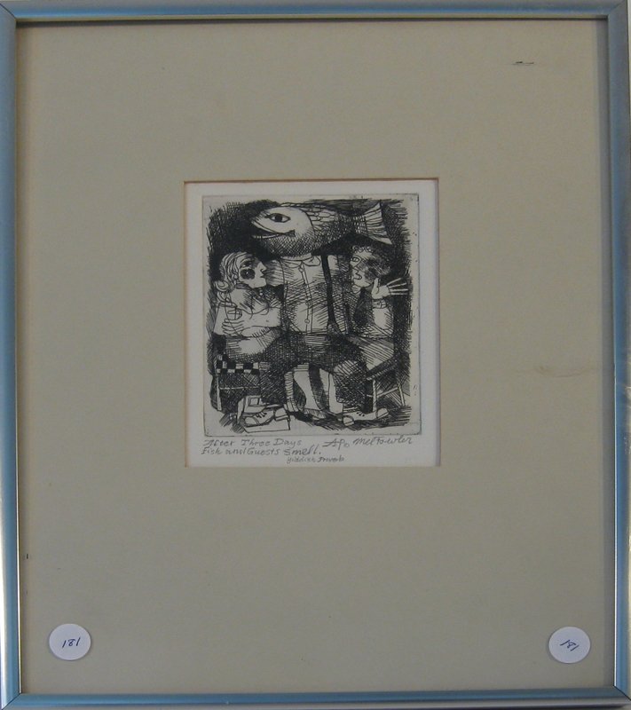Mel Fowler etching, "After Three Days Fish and Guests