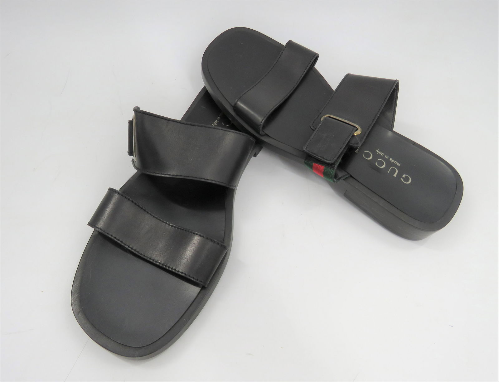 SoldPair Gucci Leather SandalsDESCRIPTION: Pair of Gucci designer leather & fabric men's sandals. CIRCA: Early 21st Century ORIGIN: Italian DIMENSIONS: (Sandals, approximately) L: 11.5", approximately a US size 12-12.5 (Box) H: 4.See Sold Price