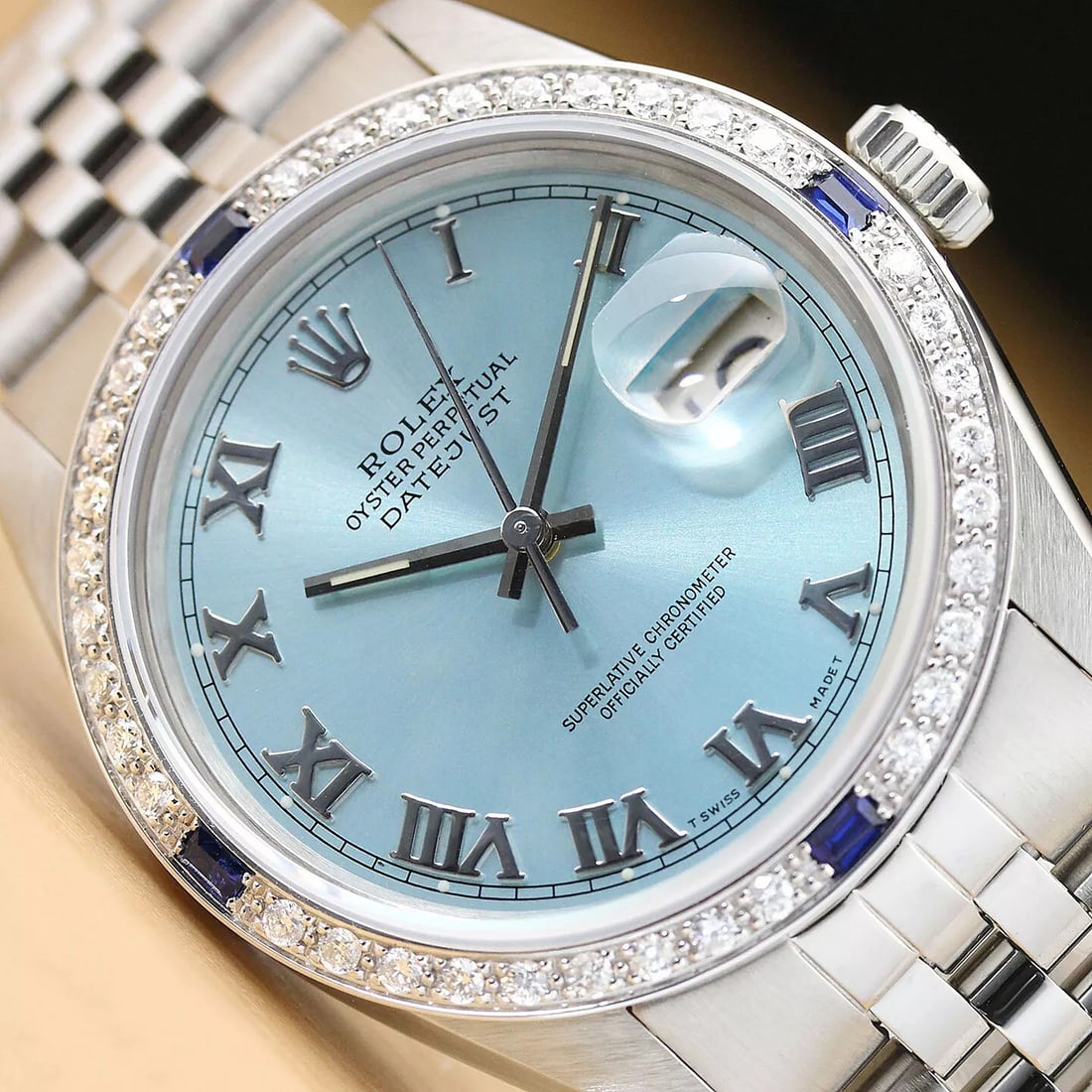 MENS ROLEX DATEJUST ICE BLUE ROMAN 18K GOLD DIAMOND SAPPHIRE & STEEL WATCH