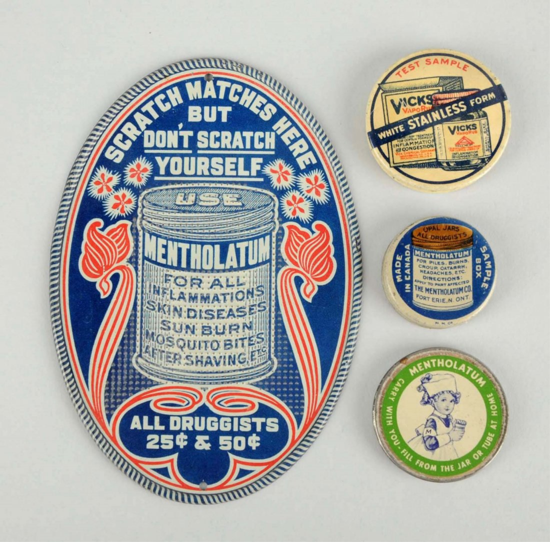 Mentholatum Tin Match Strike & 3 Sample Tins.