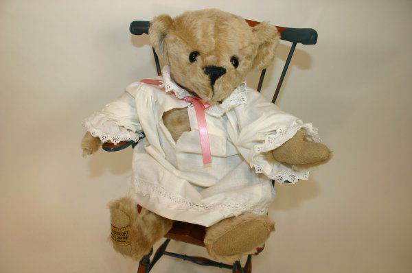 SoldMerrythought Teddy Bear,Fully jointed, mohair, glass eyes, shaved snout. Wearing a green and white ribbon around neck and has a letter attached to his chest with the merrythought crest on it. Has original tags attached and sSee Sold Price