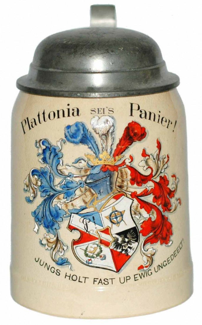 Sold1L Dueling Fratenal Student Shield 1906 SteinMettlach #1526 POG 1L. Dueling Fraternal Student Shield dated 1905. “Saronia sei's Panier!” Arnold, Freiburg. Mint.See Sold Price