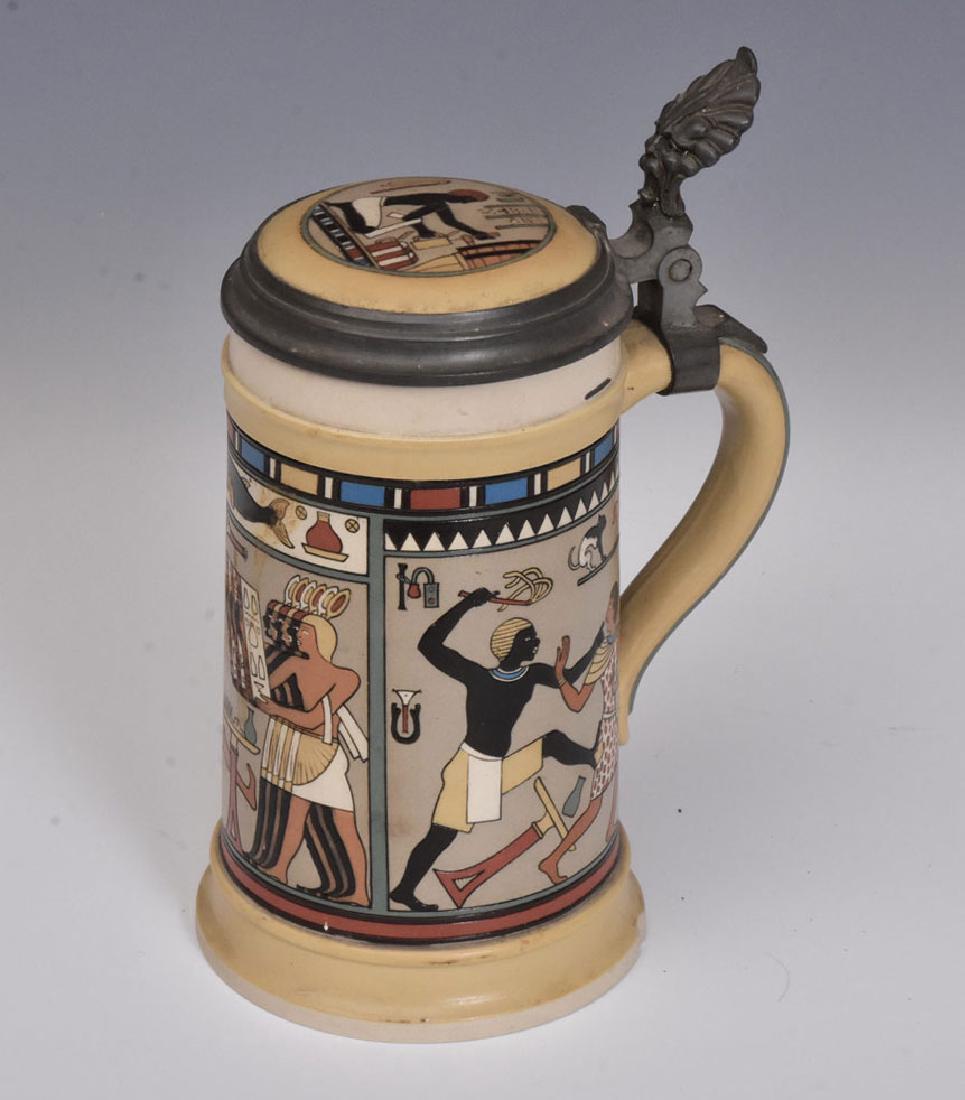 SoldMettlach stein, 1.0L, 2583 Mettlach stein, 1.0L, 2583, etched, The Egyptian stein, inlaid lid, mint.See Sold Price