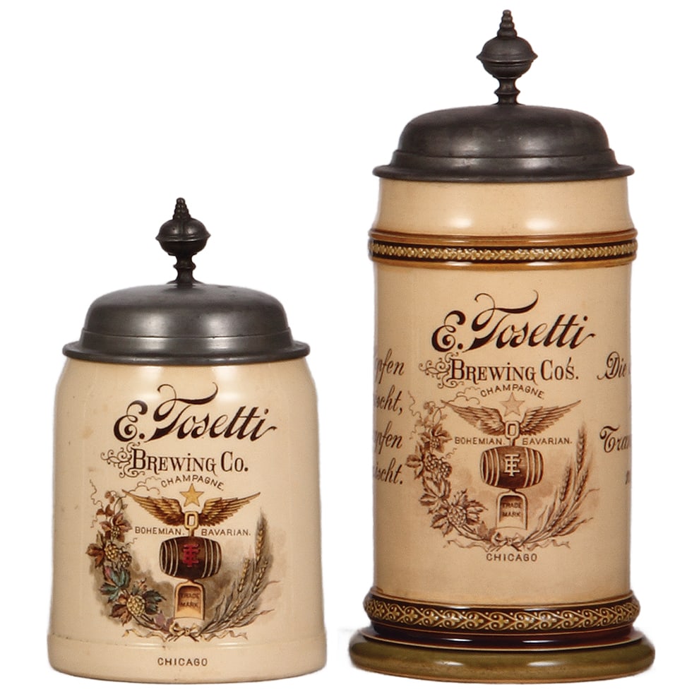 Mettlach steins (two), E. Tosetti Brewing Co. Chicago,