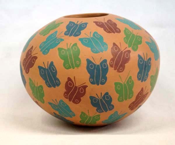 SoldMexican Mata Ortiz Polychrome Butterfly Jar, OrtizMexican Mata Ortiz Polychrome Butterfly Jar by Chela Ortiz, measures 5''H x 6''D, signed by artist, beautiful colorsSee Sold Price