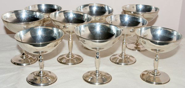 Lot 5 SGND Waterford Crystal Stemware IrelandFeb 25, 2026(17) COLLECTION OF STERLING, .800 SILVER & WEIGHTED STERLING TABLE ARTICLESFeb 22, 2026Sterling Mounted Glass Serving PiecesFeb 22, 2026Three Silver Plated Stemmed Goblets18 hrs Left12 STERLING CHAMPAGNE COUPS, 43.8 T.O.W.Mar 07, 2026Six Mexican Sterling Silver Repousse GobletsFeb 26, 2026Preisner 24 Low Sherbert Footed Sterling Silver Bowls Set of 10Jul 22, 2025Preisner 24 Low Sherbert Footed Sterling Silver Bowls Set of 10Jul 26, 20254 Vintage Silver Rimmed Cordial Glasses Dorothy Thrope B919 Lots AwayA Set of Fostoria Reflection Pattern Crystal Glassware with Platinum Rims22 hrs LeftCollection of Six Orrefors Bernadote Cut Crystal Coupe Glasses17 hrs LeftPreisner 24 Low Sherbert Footed Sterling Silver Bowls Set of 10Jul 08, 2025(3) STERLING SILVER WEIGHTED COMPOTESFeb 22, 2026S. Smyers, Six MCM Blown Glass Champagnes3 days LeftSet of 9 Francis I Sterling Silver Centerpieces by Reed and Barton 146ozFeb 28, 2026Baccarat Crystal "Harcourt" Champagne Coupes, 8Mar 12, 2026