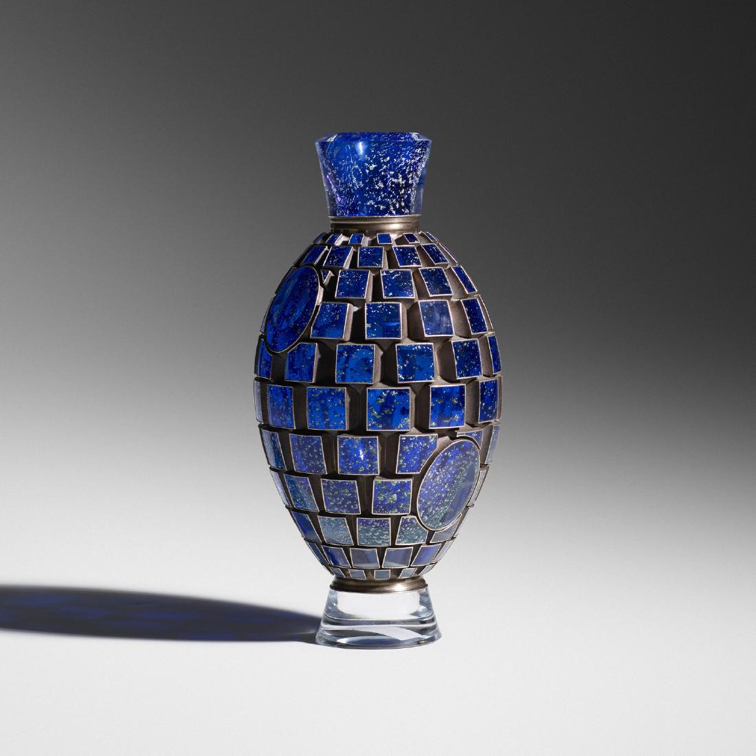 SoldMICHAEL M. GLANCY (AMERICAN, 1950-2020) CROWN JEWEL II ELECTROFORMED STUDIO ART GLASS VASEMICHAEL M. GLANCY (AMERICAN, 1950-2020) CROWN JEWEL II ELECTROFORMED STUDIO ART GLASS VASE, blue/green with interior frit decoration, urn form with horizontal bands of circles, squares, and ovals withSee Sold Price