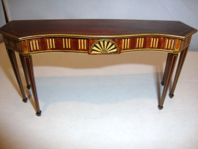 SoldMichael Walton Dollhouse Pier TableMichael Walton dollhouse miniature pier table, scalloped burl mahogany top with ebony and satinwood stringing, top edge inlaid with ebony and satinwood stringing, conforming skirt with center block coSee Sold Price