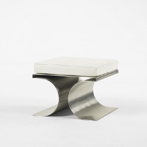 Pr Michel Boyer style Stainless Steel X Benches. Black Leather Upholstered Seat Stools. Stylish basePr Michel Boyer style Stainless Steel X Benches. Black Leather Upholstered Seat Stools. Stylish base. Heavy Stainless Frames. Dimensions: H: 13.5 inches: W: 19.5 inches: D: 19.75 inches --- Delivery O