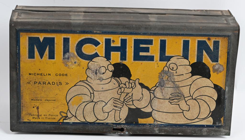 SoldMichelin w/Bibendum Wall Mounted Metal First Aid Box (TAC)rated 7.5 & 8, 8.5"x16"x4.5", the metal first aid box is in good condition, outside sign has wear and fine scratches, the inside sign is better condition. TAC #047115See Sold Price