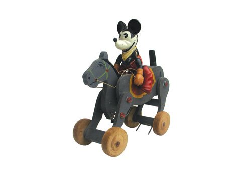 SoldJAPAN WINDUP MICKEY MOUSE COWBOY ON HORSEJapan windup Mickey Mouse Cowboy on Horse. Celluloid Mickey Mouse Cowboy on wooden Horse. All original. Windup works, but horses legs need some adjustment. Hard to find early Disney toy. 7" Very Good-See Sold Price