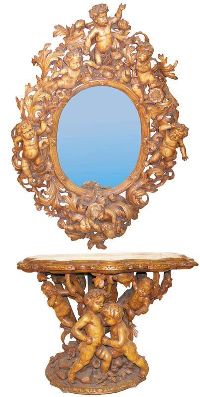 Mid 19th C. walnut mirror & m/t console w/cherubs