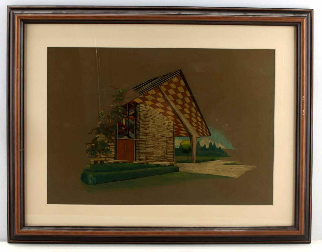 MID CENTURY ARCHITECTURAL MIXED MEDIA DRAWING