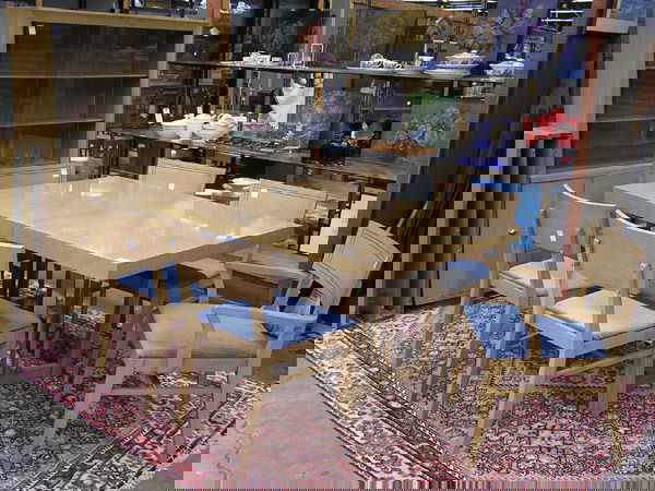 Mid-century dining set in blond mahog.