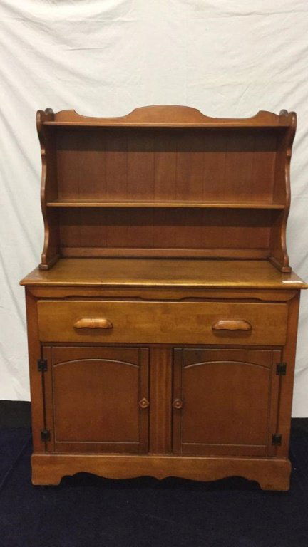 SoldHEYWOOD WAKEFIELD MID-CENTURY HUTCHMid-century hutch by Heywood Wakefield. Stamped on back with date, circa 1955. Minor wear throughout, consistent with age. Top of hutch can be detached. Measures 59'' H x 47.5'' W x 18'' D.See Sold Price