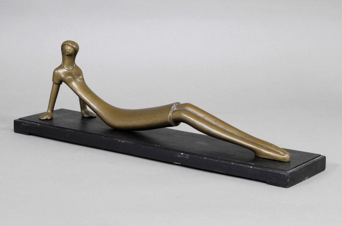 SoldMid-Century Modern BronzeMid-century modern bronze sculpture of a reclining woman, signed 'B', on a wood base 20"LSee Sold Price