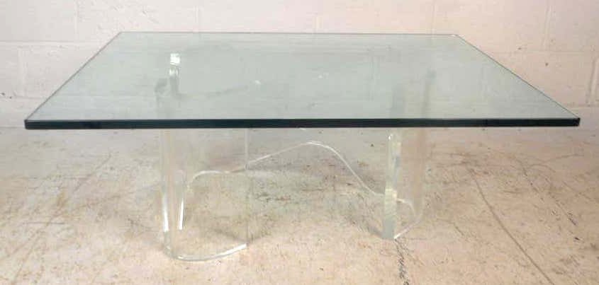SoldMid Century Modern Lucite Base Infinity Coffee Table with Shaped Glass Top 52 in. wideMid Century Modern Lucite Base Infinity Coffee Table with Shaped Glass Top 52 in. wide , no chips on glass. size: 15.5h 52wSee Sold Price