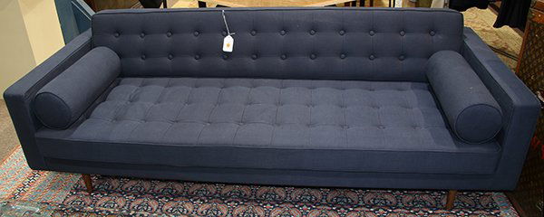 SoldCONTEMPORARY MID CENTURY STYLE GONDOLA SOFAPAINTED BLACK FINISH -- REPAIR TO TWO LEGS ON SOFA -- BLUE UPHOLSTERED -- 9' L x 32" W -- OVERALL GOOD CONDITIONSee Sold Price