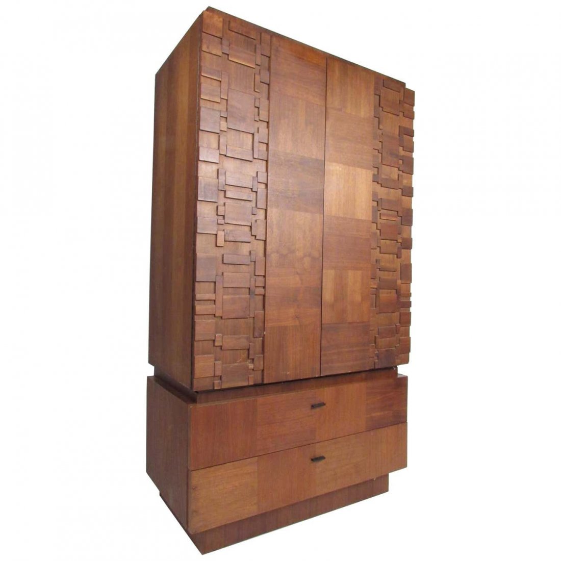 SoldMidcentury Walnut Brutalist ArmoireTwo-piece midcentury cabinet with mosaic Brutalist front. Two-door top set on a two drawer base. // PICK UP LOCATION: Brooklyn NY // Dimensions: Height: 73 in. Width: 40 in. Depth: 21 in. // ConditionSee Sold Price
