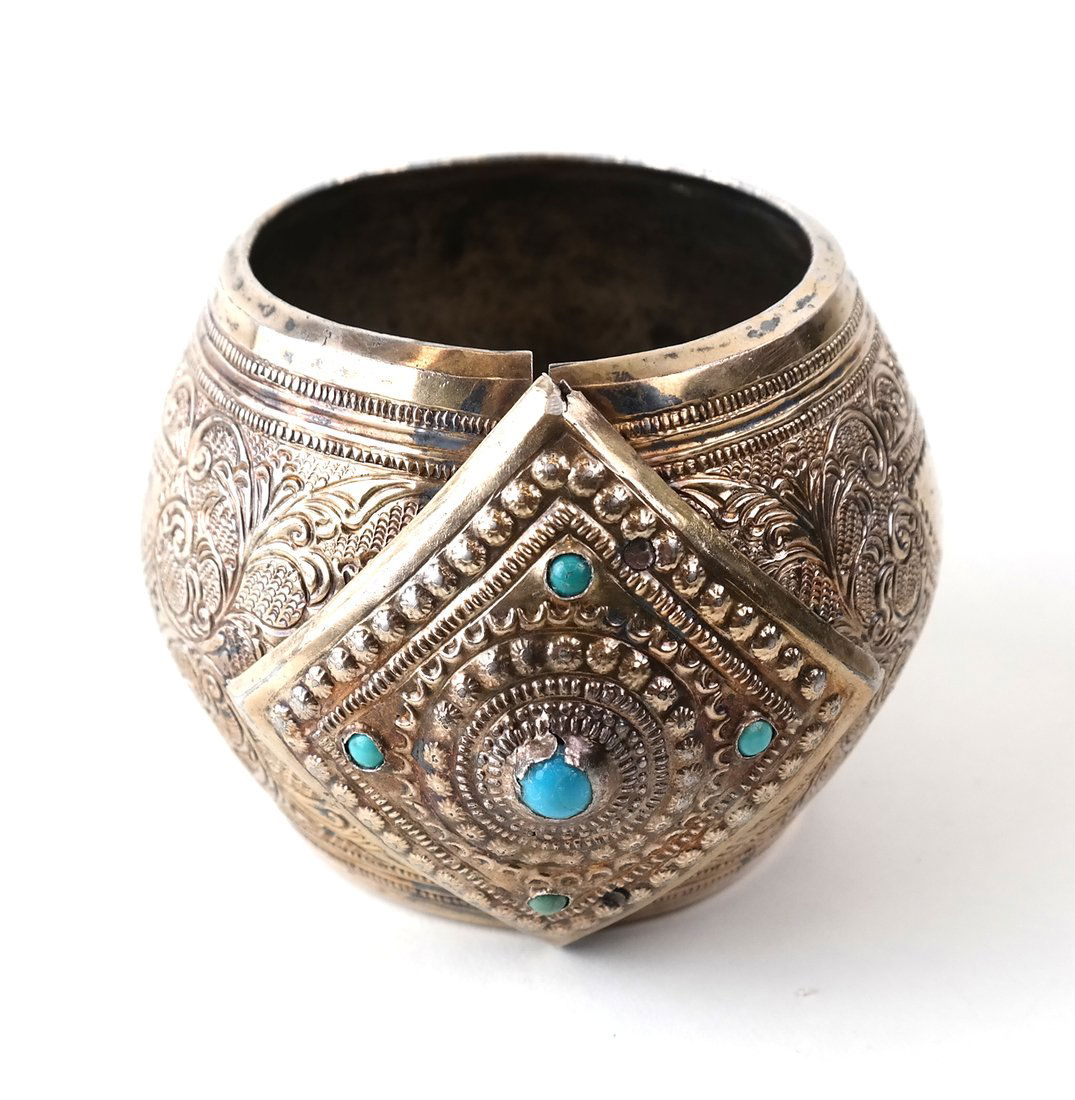 SoldMiddle Eastern BraceletMiddle Eastern hand chased bracelet with turquoise cabochon, vermeil on metal.See Sold Price
