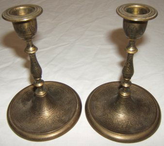 SoldAntique Persian Silver Pair Of CandlesticksMatching Persian sterling silver candle holders. Ornate etched Middle Eastern designs . Silversmith mark on both candlesticks.(view photographs) Early 1900's Dimension: 3.7" hgt. x 4" wd. Condition: GSee Sold Price