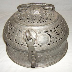 SoldANTIQUE 19c COPPER KASHMIR MIDDLE EASTERN COFFEE POTANTIQUE 19c COPPER KASHMIR MIDDLE EASTERN COFFEE POT with all over floral design to body and lid. Handle has s-shape dragon head-Interior and base have silver finish. Inside the pot was a reference toSee Sold Price
