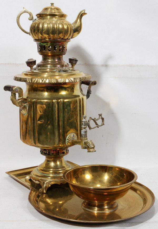 ANTIQUE RUSSIAN IMPERIAL BRASS SAMOVAR W STAND AND BOWL