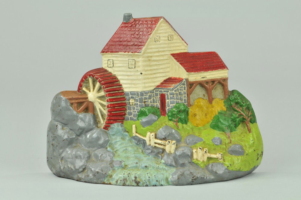 SoldWater Mill Cast iron DoorstopCast iron door stop Old Mill #3, possibly by Greenblatt, unmarked, 1920's, single piece flat back cast. Provenance: Single owner collection, suburban Philadelphia estate. Size: 10"T Shipping Note: ForSee Sold Price